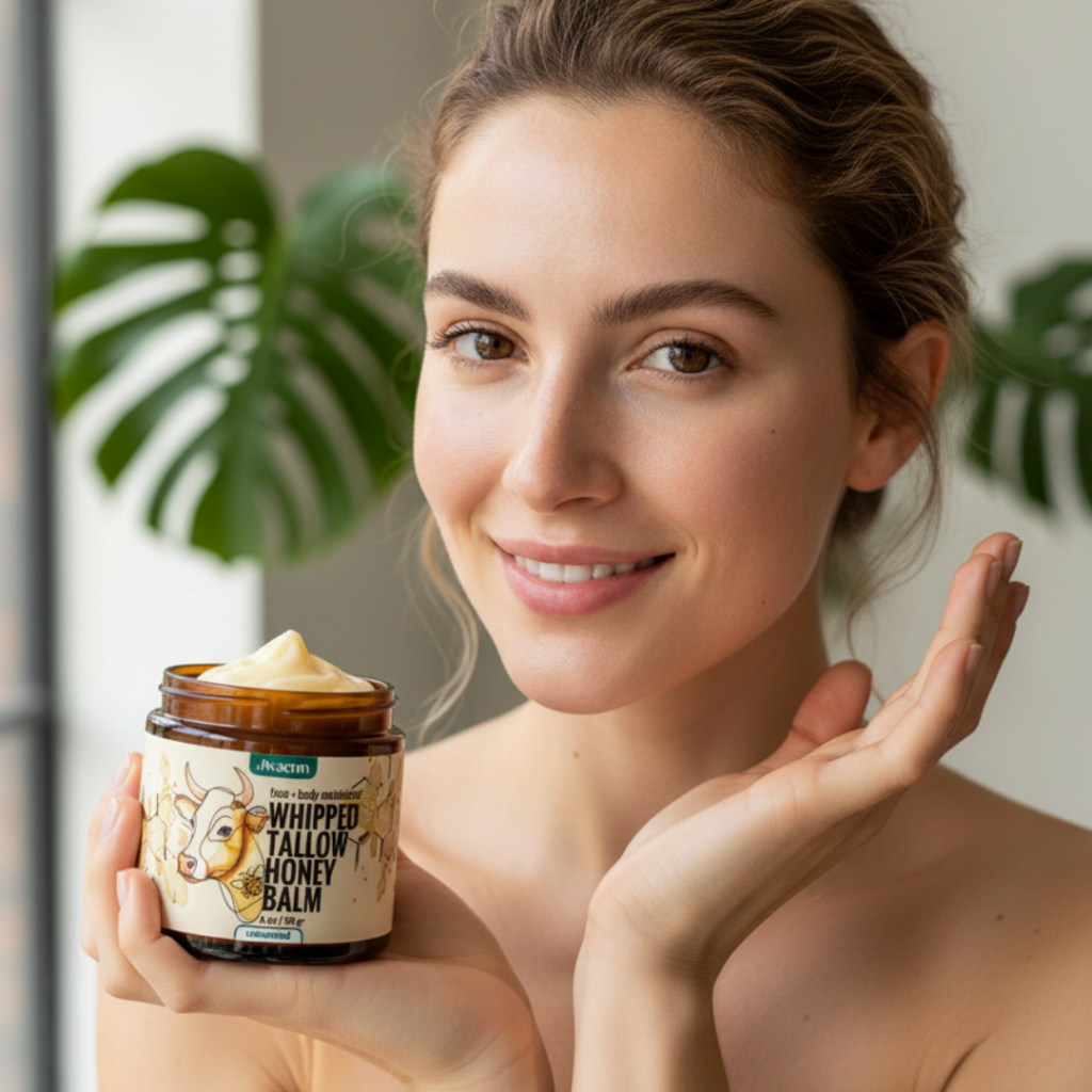 JWAENN Whipped Tallow Honey Balm is a multi-purpose, intensive moisturizer designed to nourish, soothe, and protect dry, cracked, or irritated skin. It is excellent for use on the face, hands, lips, and body, creating a protective barrier that helps lock in moisture and support skin barrier function.